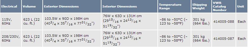 VWR® symphony™ Ultra-Low Temperature Freezer Specifications